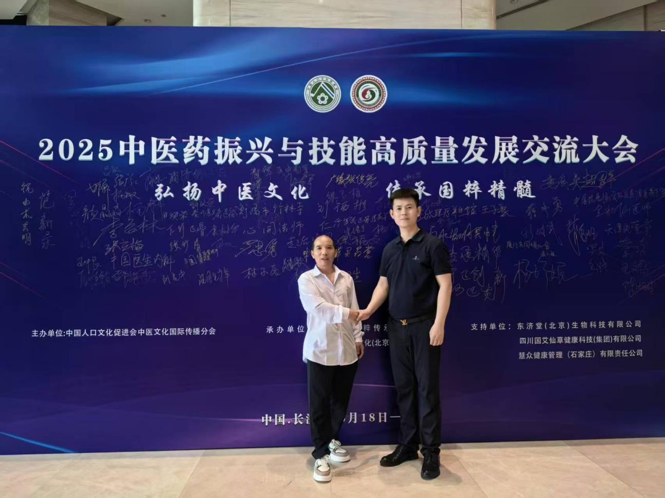 周岐武(左)参加2025年中医药振兴与技能高质量发展大会,与与全国人口中医协会会长贺洪起合影
