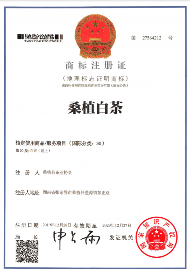新修订的《中华人民共和国商标法实施条例》首次将地理标志可作证明商标和集体商标写进条例。条例规定,以地理标志作为证明商标的,其商品符合使用该地理标志条件的自然人、法人或者其他组织可以要求使用该证明商标,控制该证明商标的组织应当允许。因此,2021年9月,张家界市农业农村局(张农发〔2021〕70号)发出关于《“张家界茶”地理标志证明商标使用管理办法》《“张家界莓茶”地理标志证明商标使用管理办法》的通知,明确“张家界茶”“张家界莓茶”地理标志证明商标使用的地域范围和条件、申请使用程序以及使用人的权利和义务,落实“张家界茶”“张家界莓茶”品牌公共化。为了促进“张家界茶”“张家界莓茶”生产和经营,维护和提高“张家界茶”“张家界莓茶”地理标志证明商标在国内外茶产品市场的声誉,保护使用者和消费者的合法权益,“张家界茶”地标注册人张家界市农业科学技术研究所根据《“张家界茶”地理标志证明商标使用管理办法》授权张家界茶业发展公司、万宝山茶业公司等10家传统茶叶加工企业使用“张家界茶”地理标志证明商标。“张家界莓茶”地标注册人张家界市农业科学技术研究所根据《“张家界莓茶”地理标志证明商标使用管理办法》授权湖南乾坤生物科技公司、张家界茶业发展公司等33家企业使用“张家界莓茶”地理标志证明商标。“桑植白茶”国家地理标志证明商标注册人桑植县茶业协会根据《“桑植白茶”地理标志证明商标使用管理办法》授权湘丰桑植白茶公司和西莲茶业公司等23家茶企使用“桑植白茶”地理标志证明商标。2022年1月,张家界市农业科学技术研究所向国家知识产权局递交首批地标使用授权的9家传统茶叶加工企业、18家莓茶加工企业备案申请书;2月,国家知识产权局发出《商标使用许可备案通知书》。接到同意备案批复以后,组织茶叶加工企业签订《防伪标签使用协议书》,落实标贴印制数量,委托北京中宇恒泰防伪科技中心印制并且利用其平台进行质量追溯管理。至2022年6月,共有4家传统茶叶加工企业、15家莓茶加工企业销售的产品均已贴上防伪溯源标签,张家界市“三茶”开启地标产品占主导的新时代。