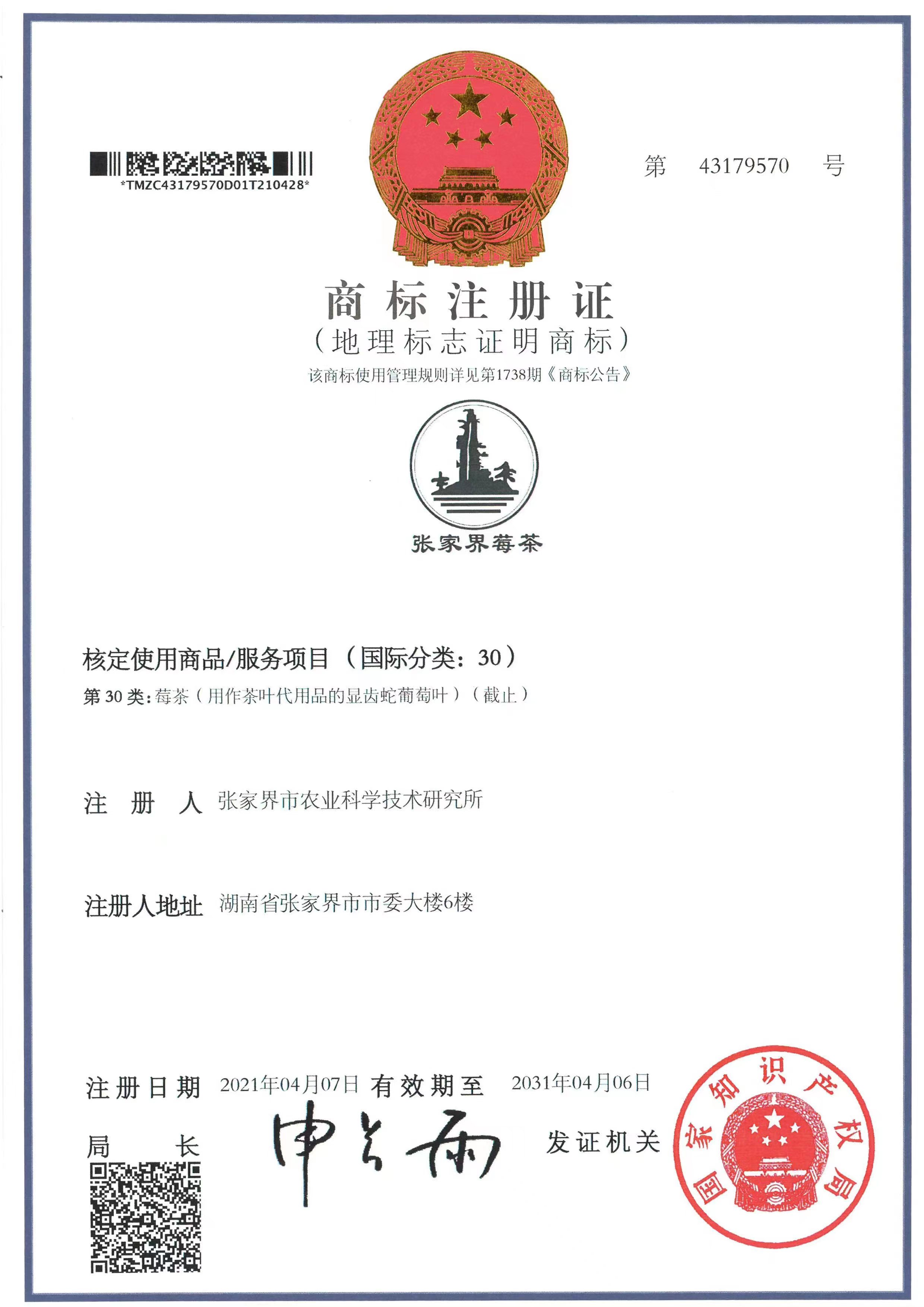 明清时期已经出现“张家界”名称。清代王先谦编辑的《湖南全省掌故备考》曾载:“无事溪(今沙堤溪)源出永定县张家界。”清代《道光永定县志》也载:“无事溪(今沙堤溪)发源于张家界。”张家界市的前身是国务院于1988年5月批准建立的省辖地级大庸市。1994年4月,又经国务院批准更名为张家界市。张家界市各级党委、政府引导打造茶叶区域公用品牌。2019年12月,“桑植白茶”商标由国家知识产权局核准,注册为地理标志证明商标。2020年1月,张家界市委常委会议研究决定:“市农业农村局负责,加快申报张家界茶、张家界莓茶国家地理标志 证明商标,打造区域公共品牌,确定知识产权。”因此,张家界市农业农村局、张家界市市场监管局、张家界市地方志编纂室和永定区农业农村局等单位整理资料,加强合作。不仅把“张家界茶”“张家界莓茶”的资料编入《张家界年鉴2019》,而且上报到国家知识产权局。2021年4月,“张家界茶”“张家界莓茶”地理标志证明商标由国家知识产权局商标局核准注册,用以证明“张家界茶”“张家界莓茶”的原产地域和特定品质。此次国家地理标志证明商标的成功注册,推动张家界市特色产业快速发展,提高特色农业品牌市场竞争力。 市市场监管局按照市委、市政府提出的要求,坚持把“商标兴市”战略作为知识产权工作的立足点、服务地方经济的切入点,推进全市知识产权工作更上一层楼。