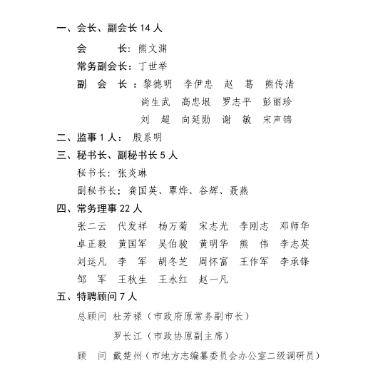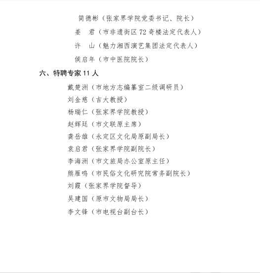 根据2023年8月10日张家界市第二届非物质文化遗产研究与保护促进会会员大会选举结果,并报市文旅局、市民政局同意,熊文渊、丁世举、张琳炎等39名同志为张家界市非物质文化遗产研究与保护促进会理事会常务理事,杜芳禄、罗长江等7名同志为张家界市非物质文化遗产研究与保护促进会特聘顾问,戴楚洲、刘金慈等11名同志为张家界市非物质文化遗产研究与保护促进会特聘专家。