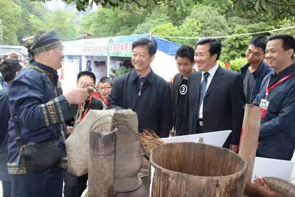 在张家界森林公园举办的春天茶会展示现场观看牧羊冲甑蒸茶制作器具。