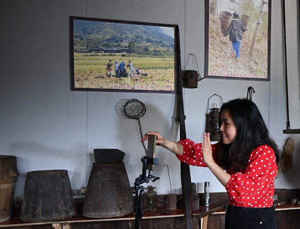 回乡创业青年龚赛军正在她自己创建的农耕文化器物展览馆直播