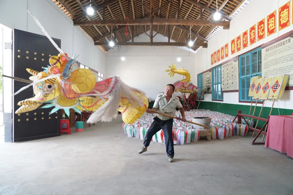 国家级非物质文化遗产板板龙灯传承人李承锋举起龙头表演。