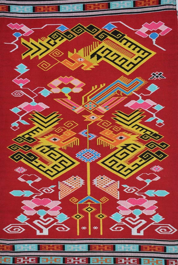 西朗卡普作为土家文化的重要组成部分,内容上既体现以继承民族传统文化和工艺为内涵的品格,又体现以融合各民族先进文化因素为外延的社会与时代特征。西朗卡普在传播优秀传统文化之时,也在不断地吸收外来文化因子发展自己。依山而居的土家族人崇尚自然,保持本民族独特的风格,并在继承中创造,使土家织锦充满艺术魅力。如西朗卡普的“福禄寿喜”“富贵双全”等汉字题材就是汉族、土家文化交流交溶的织锦工艺品,使西朗卡普不断步入更高的艺术品位。土家织锦是土家历史、地理环境、民族文化、审美情趣等因素的载体,是实用性与装饰性的结合体。