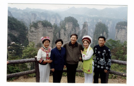 2001年,朱镕基夫妇在天子山与民歌手向佐绒、黄道英和庹年校合影。