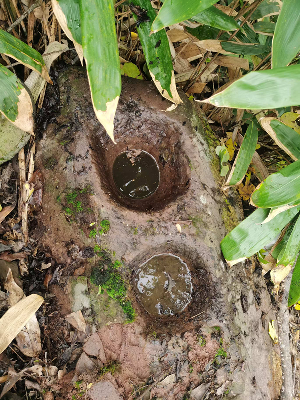 图为古人在滑潭铺路边岩石上凿出的岩钵。