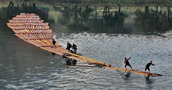 溇水出长潭河饭甑山峡谷后,河面变得宽敞许多,放排客顺湾而下,到麻寮铺打尖休息。