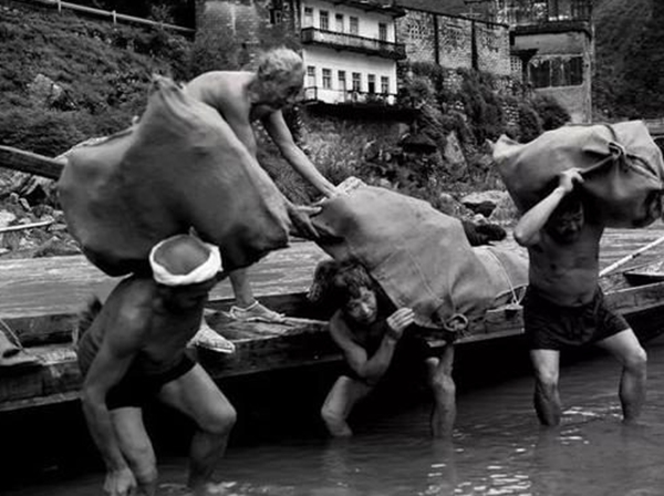 油榨桥外,是麻寮铺老码头,南来北往船家在此靠岸,卸货佬下到浅水处争着卸货。