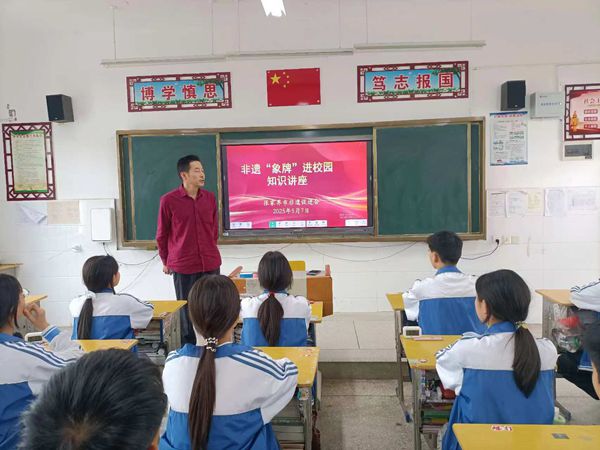 桑植县非遗促进会会长熊传清给学生介绍象牌的传承价值。