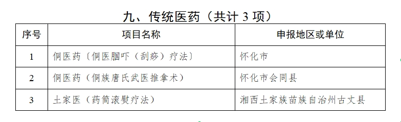 根据目录,新增侗医药〔侗医腘吓(刮痧)疗法〕、侗医药(侗族唐氏武医推拿术)、土家医(药筒滚熨疗法)3个省级非遗传统医药类项目,以及针灸(湖湘针灸)、中医正骨疗法(杨大毛正骨术)、中医传统制剂方法(澧州制膏技艺)、中药炮制技艺(安化黄精九制传统技艺)、中医诊疗法(秦宫刮痧术)、苗医药(苗医正骨术)等25项省级非遗扩展传统医药类项目。