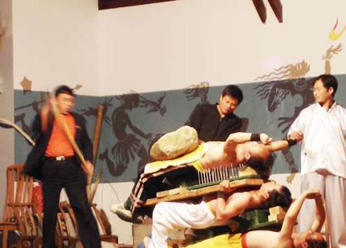 大庸武术由《腹卧钢叉》、《卧刀床碎石》、《卧钉床碎石》、《单指钻砖》、《手砍石头》、《银枪刺喉》、《头顶碎砖》、《胸前吊砖》、《头顶碎石》等二十余套组成。它神就神在同等道具的情况下,其他地方的硬气功无法表演。如《腹卧钢叉》,表演者俯卧在一根叉尖上,尖仅1-2毫米,待表演者四肢平展后,旋转360°,而其他地方的硬气功表演者,腹底叉尖是三个受力点,外面两根叉尖钝而且向外成“八”字形。《卧钉床碎石》的钉床只有7-9颗大元钉,而其他地方硬气功表演用的钉床是一百多乃至几百颗元钉,这样就受力面积大,面压强小。如果要他们用我们的钉床表演,他们是无法进行的。因此,它是民族认同的纽带,具有不可替代的人类学、民族学、民俗学、历史学、社会学、艺术学价值。是本土武学奇葩。