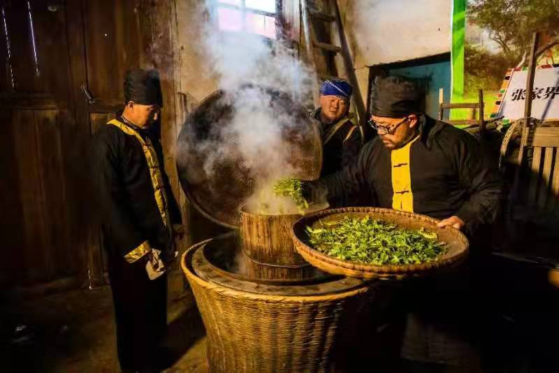 市级非遗传承人高忠垠(中)正在制作牧羊冲甑蒸茶