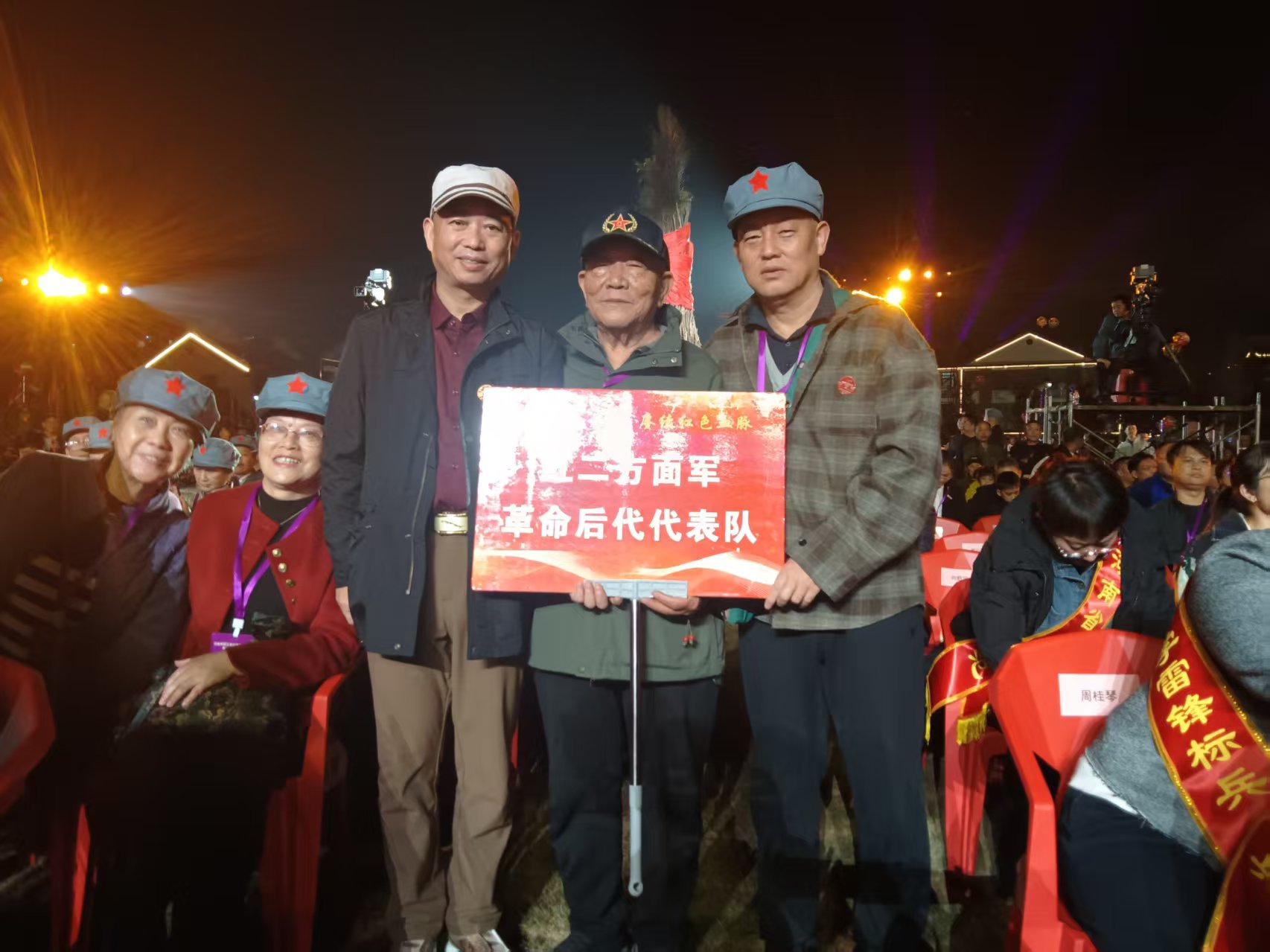 左1.红色后代杨帆,左2.红色后代向国荣,左3.红色后代张万润在“火把节”现场合影留念
