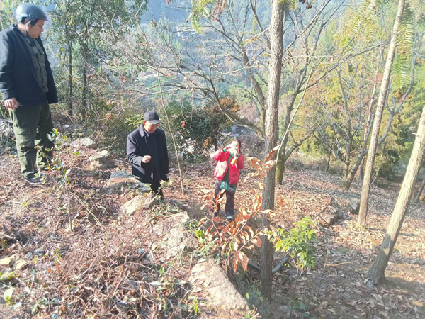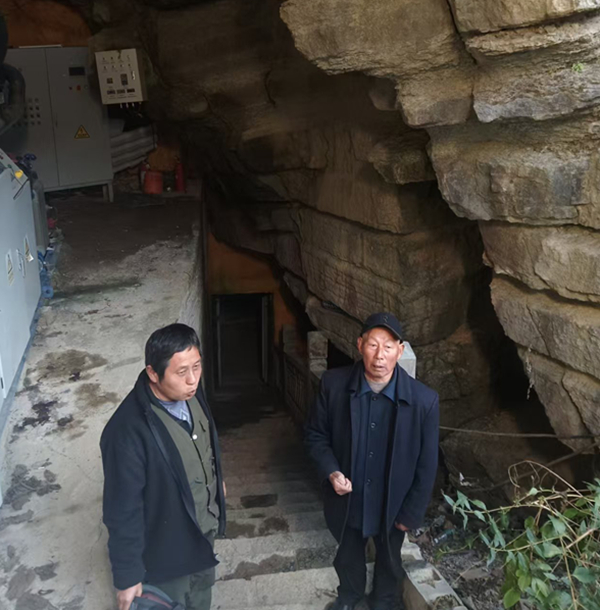 刘新桥(左1)到当年覃辅臣落难躲藏的山洞介绍情况